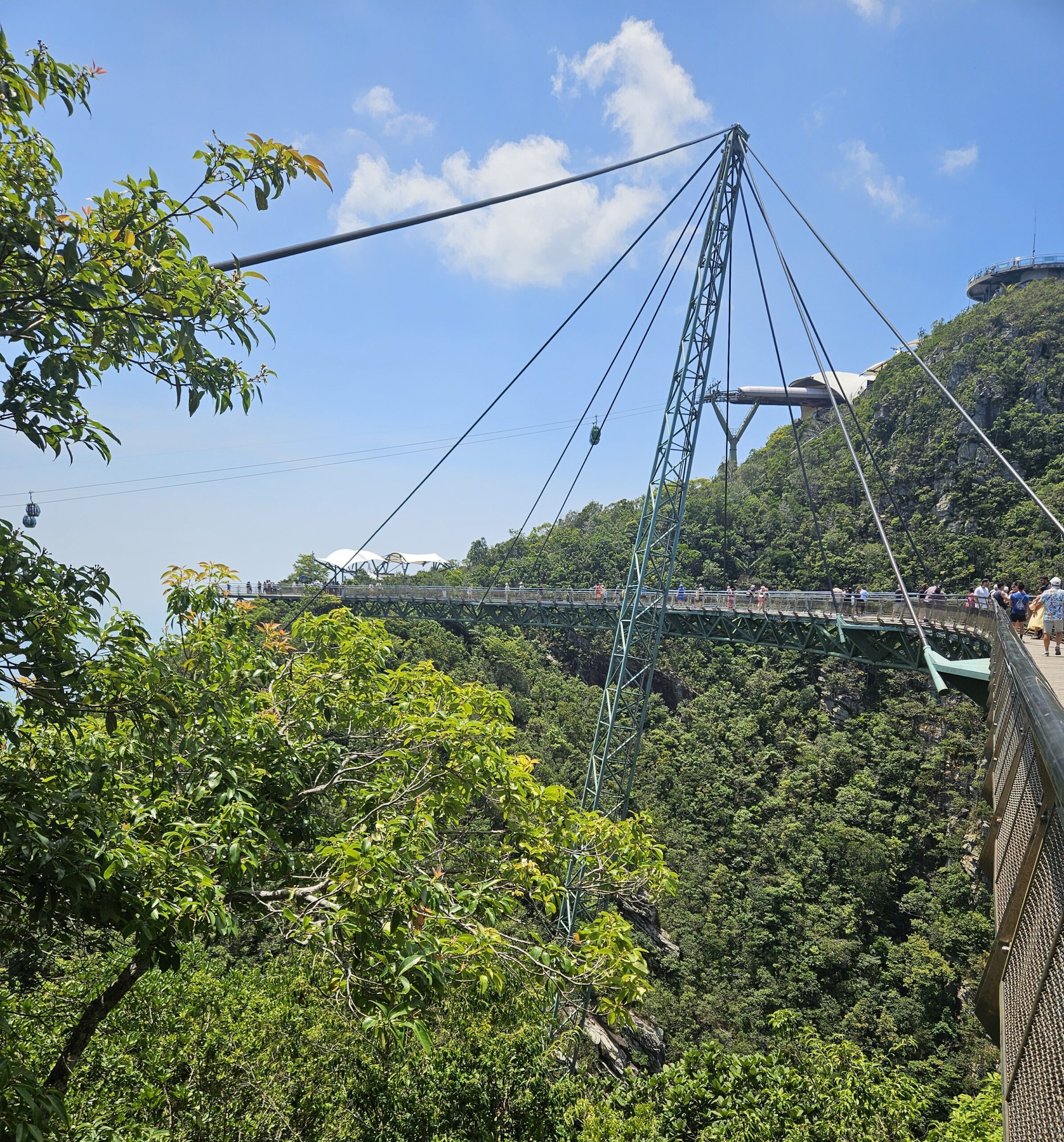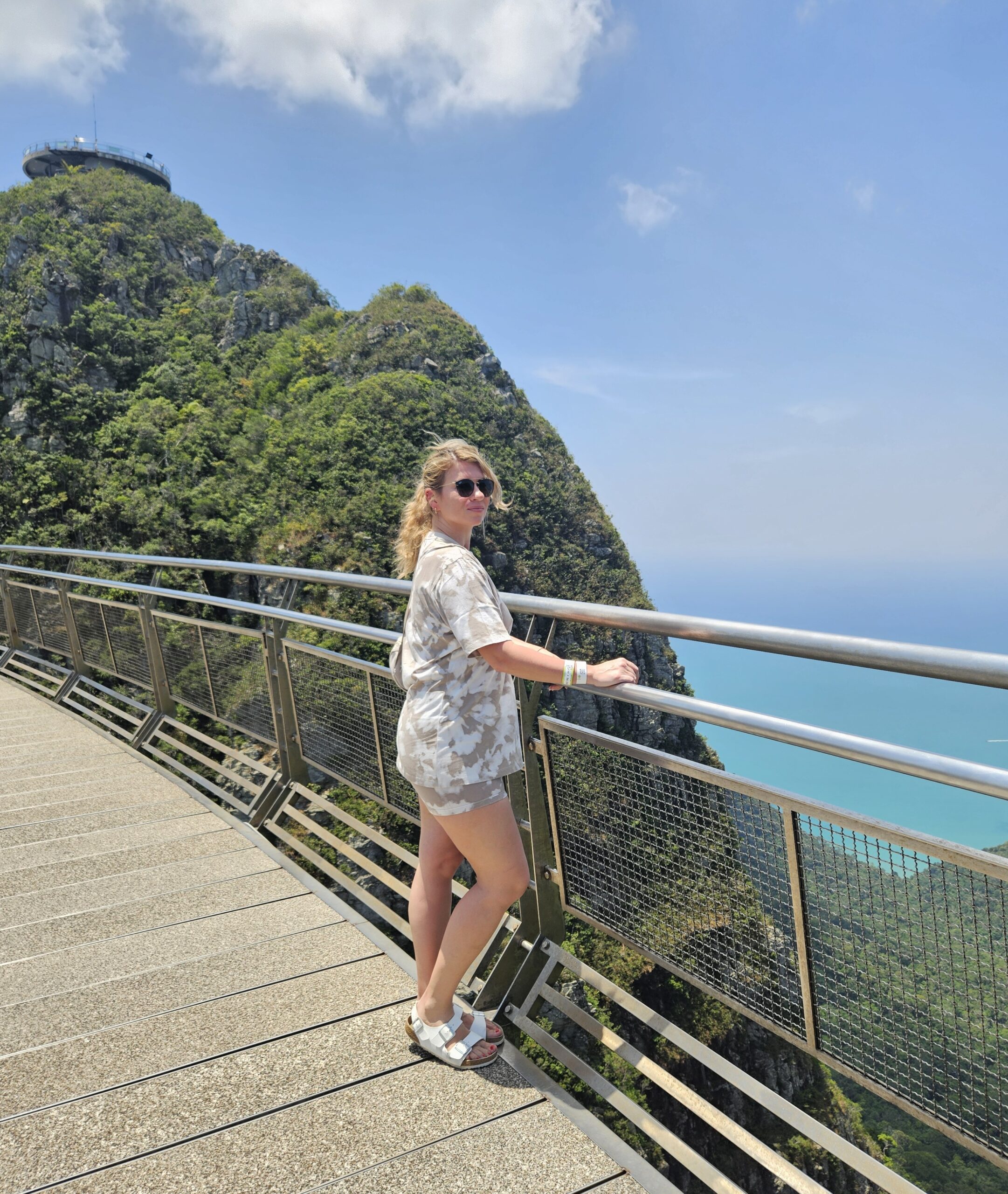 Następnego dnia wybrałam się na Langkawi Cable Car. Bilet kupiłam również przez aplikację Klook i kosztował około 80 zł. Langkawi Cable Car to jedna z najbardziej stromych kolejek na świecie, a widoki na dżunglę i morze są niesamowite. Na górze jest też słynny Sky Bridge – most zawieszony nad przepaścią. Osobom zmagającym się z lękiem wysokości raczej odradzam tę atrakcję.