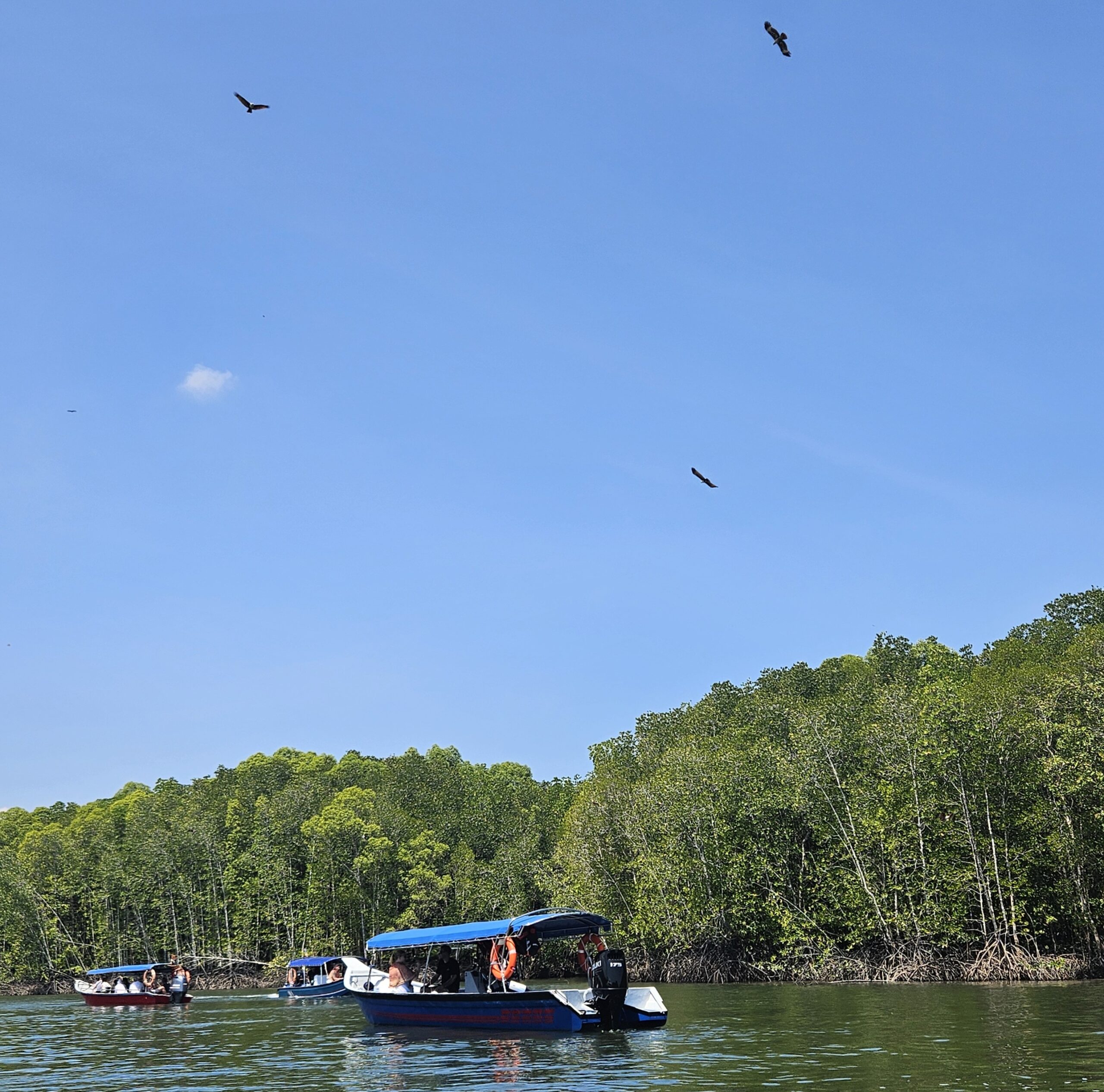 Najpierw przeprawa łodzią do groty nietoperzy, gdzie można było zobaczyć setki tych zwierząt złowieszczo wiszących pod sufitem jaskini, następnym przystankiem była farma ryb, gdzie na lunch podali nam kurczaka xd. Potem łodzią między namorzynami, oglądałam stada makaków, a na koniec obserwacja orłów. Ciekawostka: w potocznym języku malajskim Langkawi oznacza Wyspę Orła.